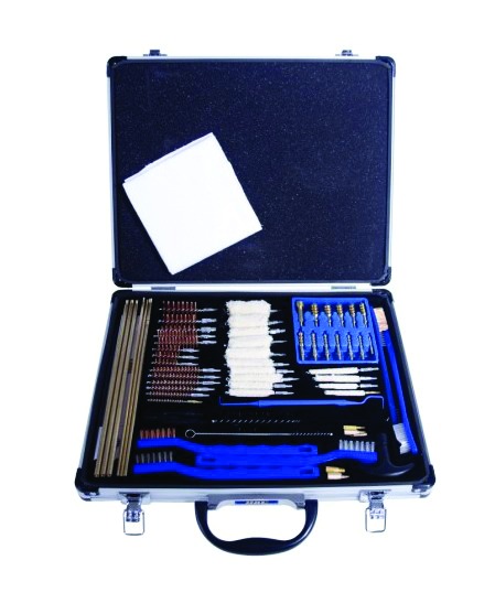 | This 63 piece kit contains two sets of three brass rods, one handle, 14 bore brushes (.17cal-.54cal and 410/20/12ga), 10 mops (.17cal-.54cal and 410/20/12ga), 4 slot tips for patches, 3 solid brass accessory adapters, 3 utility brushes, 2 choke/breech cleaning brushes, 2 double ended utility brushes, 1 double ended cleaning pick, 13 piece solid brass jag set, 1 polishing cloth and 2 sets of cleaning patches in an aluminum case |