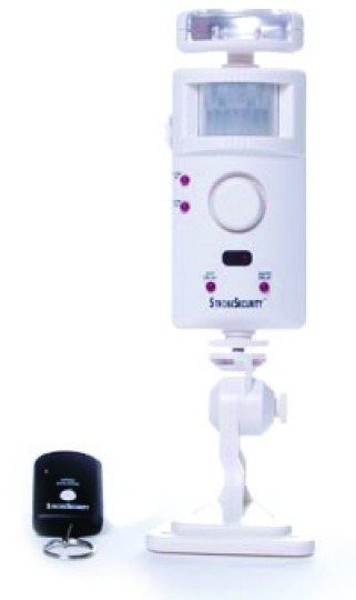 Infrared sensor detects motion up to 30 ft. away with a wide 110º beam When someone draws near, a piercing 120 dB siren wails and the built-in strobe light flashes continuously Automatically re-arms itself Armed and disarmed by included keychain remote 10-second exit and entry delay | Adjustable wall mount with provided brackets and hardware