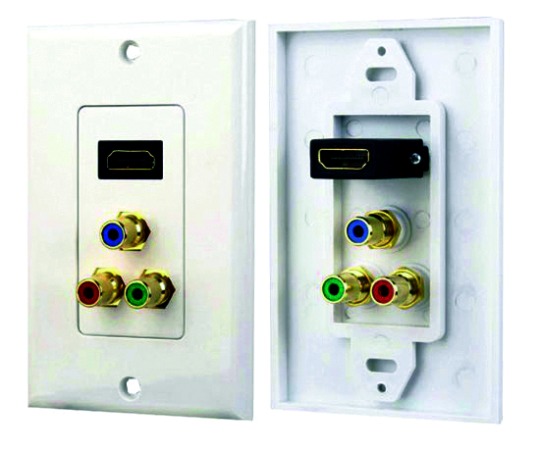 (3) Gold plated Color-Coded RCA Jacks (Red/Green/Blue) Provides wall mounted RGB/RCA connection for one device to your video system Mounts to Standard Electrical Box High Impact ABS Plastic Attractive Decora style white wall plate |