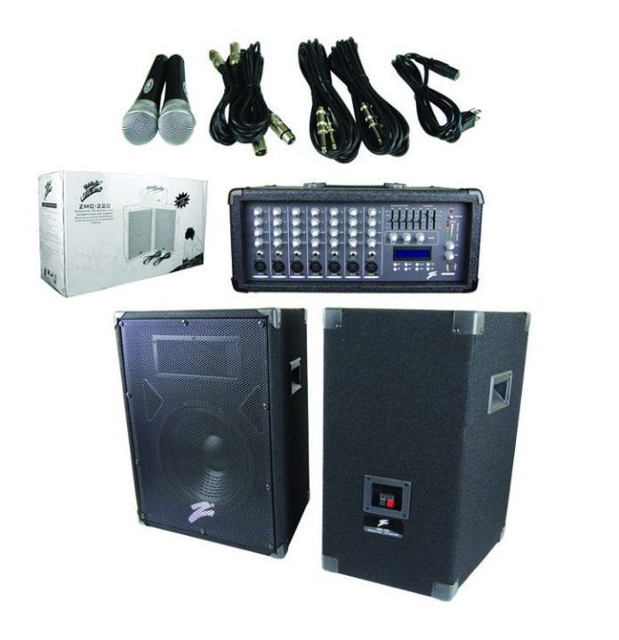 1 RCA Output Power: 2 x 200Watts THD: <0.1% (At 1 KHz 10W), Tone Controls Bass: 100Hz+-12dB • Treble: 10KHz+-12dB Frequency Response: 20Hz - 20KHz+-1dB Power: -115V60Hz or -230V/50Hz • Dimensions: (WxDxH) 425x280x195 mm Weight: 7 Kg Treble Bass Effect volume on each channel Microphone, Microphone & sepaker Cable x 2 2-Way Configuration with passive filter | 4” x 10” horn tweeter 12” Woofer